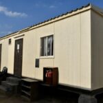 A beautiful shot of white small rooms on a beach shore near the water under a cloudy sky